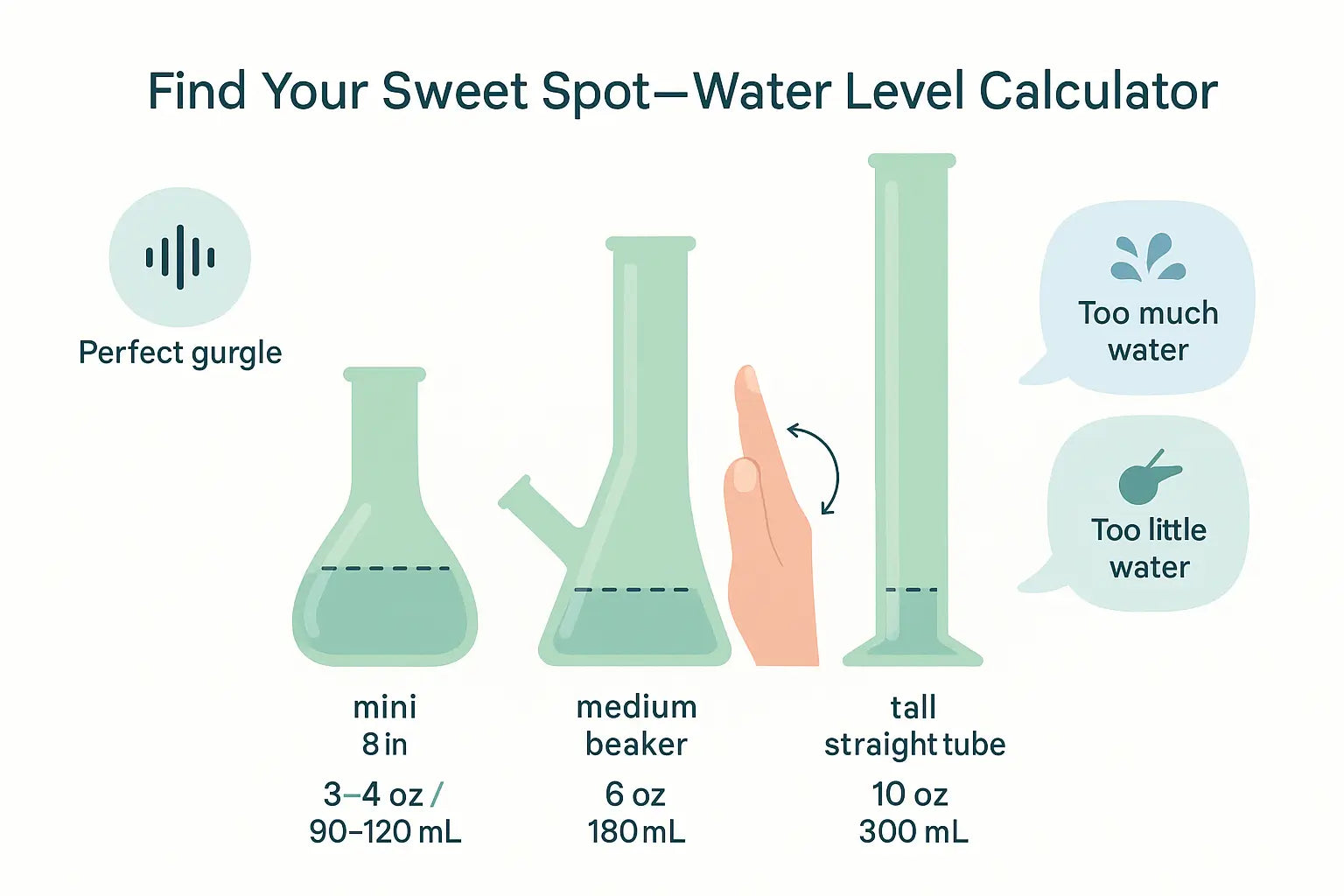 No app handy? Use the “finger test.” For a standard glass bong, pour water until the down-stem is submerged, then place an index finger on the outside of the tube marking that spot. Add or remove water in half-finger increments until the pull feels right. On minis (6–8 in.), that’s roughly 3–4 oz (90–120 mL). Ten-inch beakers often land near 6 oz (180 mL). Tall straight tubes (15 in. plus) can need 10 oz (300 mL) for optimal filtration. Write your number on masking tape and stick it to the base—future fills take ten seconds flat. This low-tech method beats guessing and ensures smooth filtration every time.