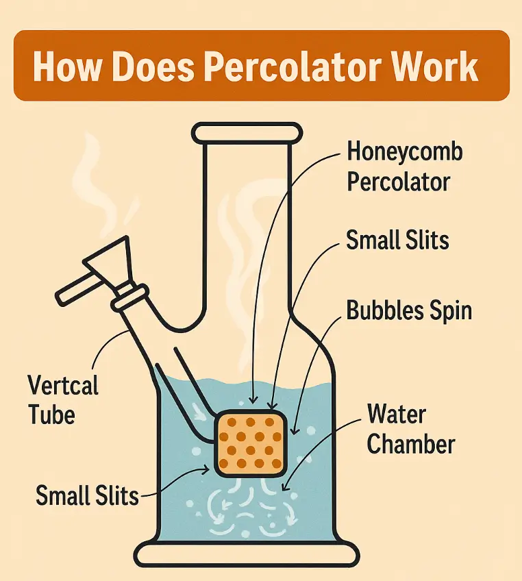Think of a perc as a matrix percolator or honeycomb percolator sitting in the “vertical tube” of your bong. When smoke passes through its small slits, it’s sliced into micro-streams that instantly form more bubbles. Those bubbles spin in the water chamber, slowing the smoke and giving water time to filter and cool it. A 2024 peer-reviewed study on water-pipe aerosols found that finer bubbles reduce average particle size by about 30 %, easing the load on your airways. This diffusion is why a single honeycomb disc can outperform older tree percolators with multiple arms—more holes equal better filtration with minimal drag.