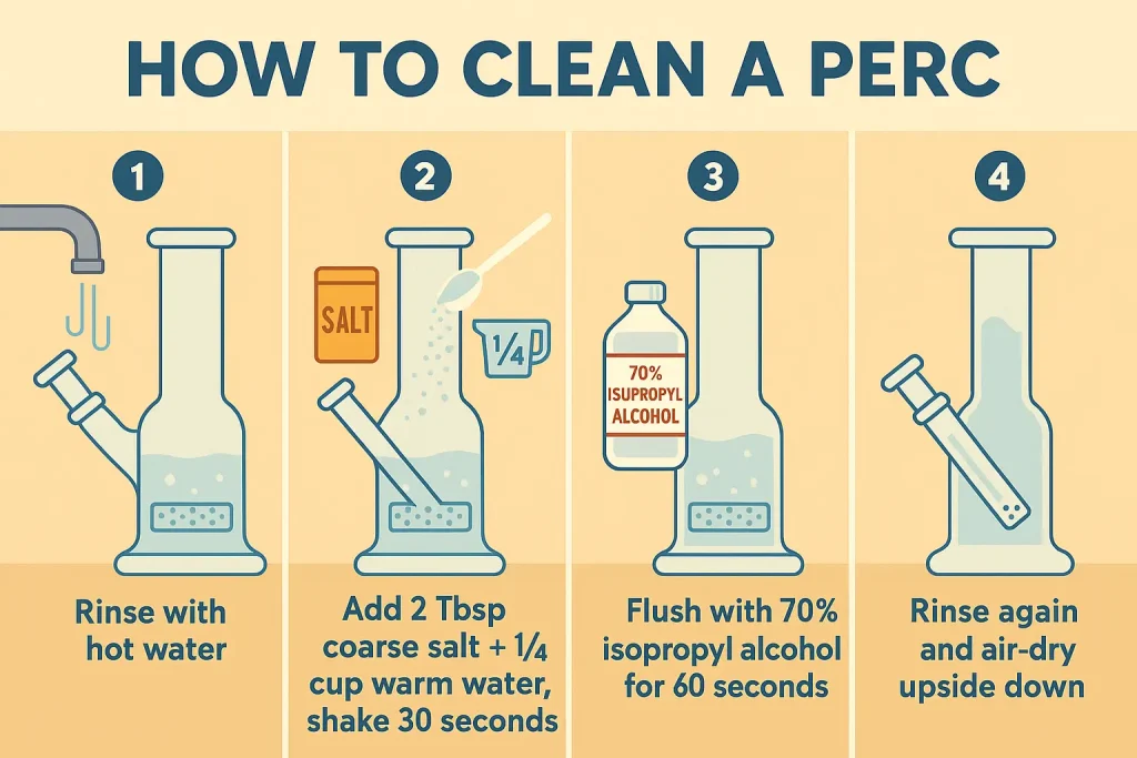 A dirty perc stops working; resin clogs the tiny holes so smoke passes in chunky streams instead of silky clouds. Follow this fast cycle once a week: