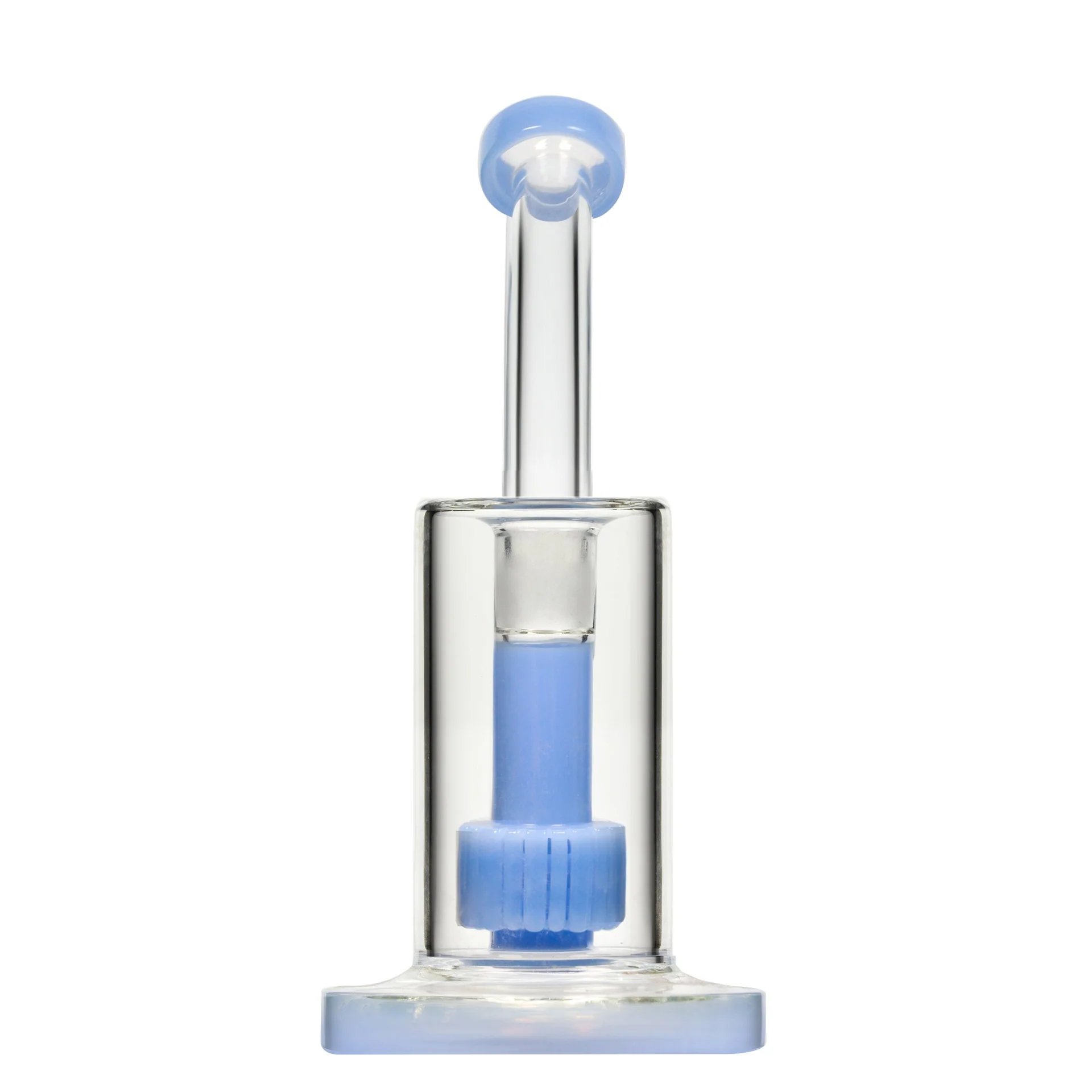 Bring lab-quality smoothness to your next session with a compact piece that punches well above its size. Hand-blown from crystal-clear borosilicate, this 9.3-inch rig centers a sky-blue turbine percolator inside a protective glass cylinder. As you draw, the slotted turbine creates a whirlpool of fine bubbles that cool and scrub each hit before it reaches the angled mouthpiece—so flavor stays crisp while harshness stays out.