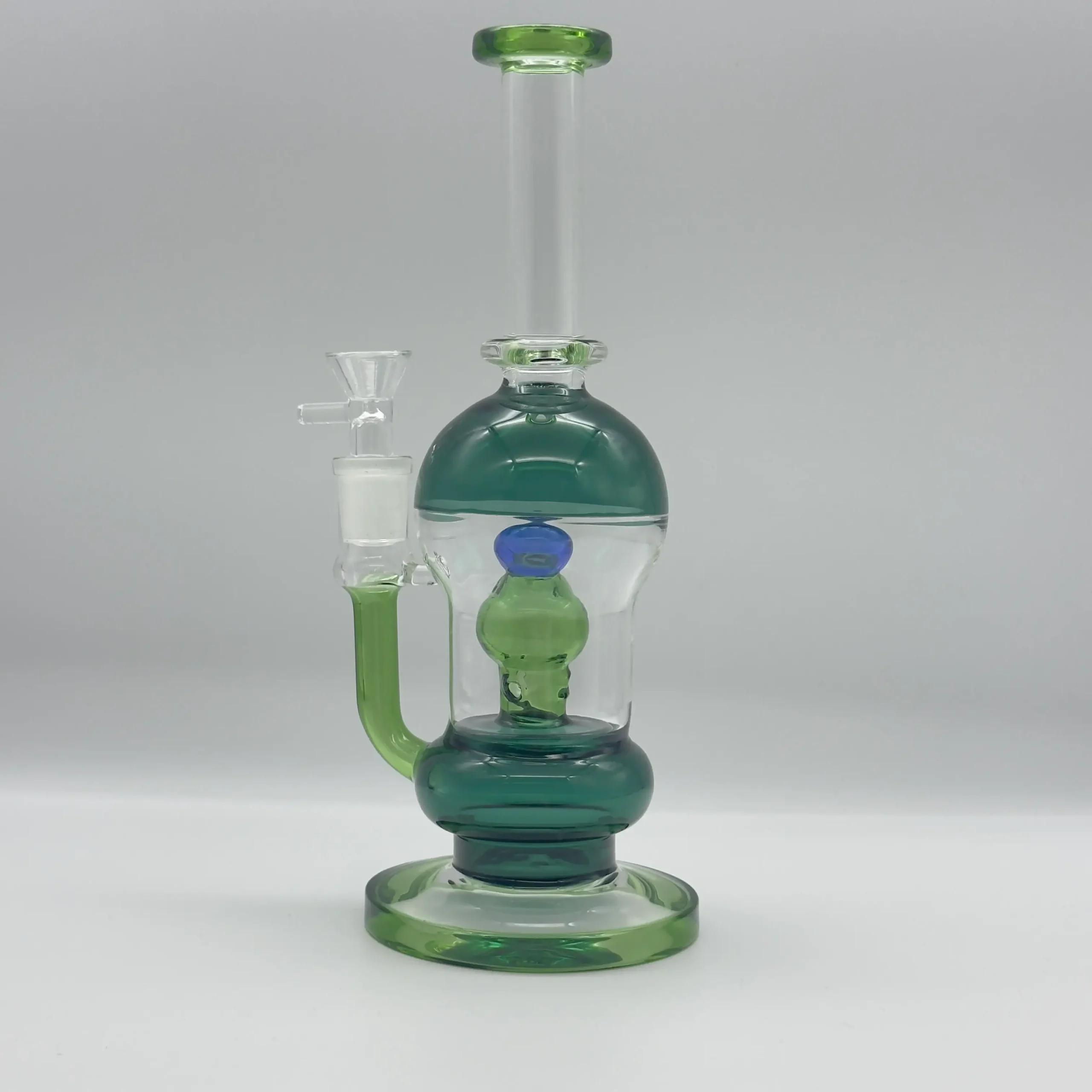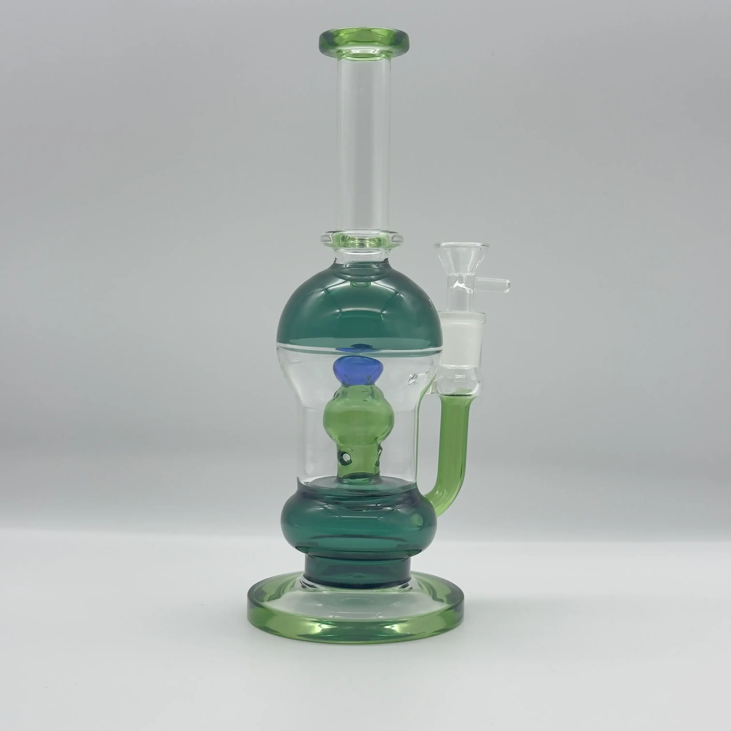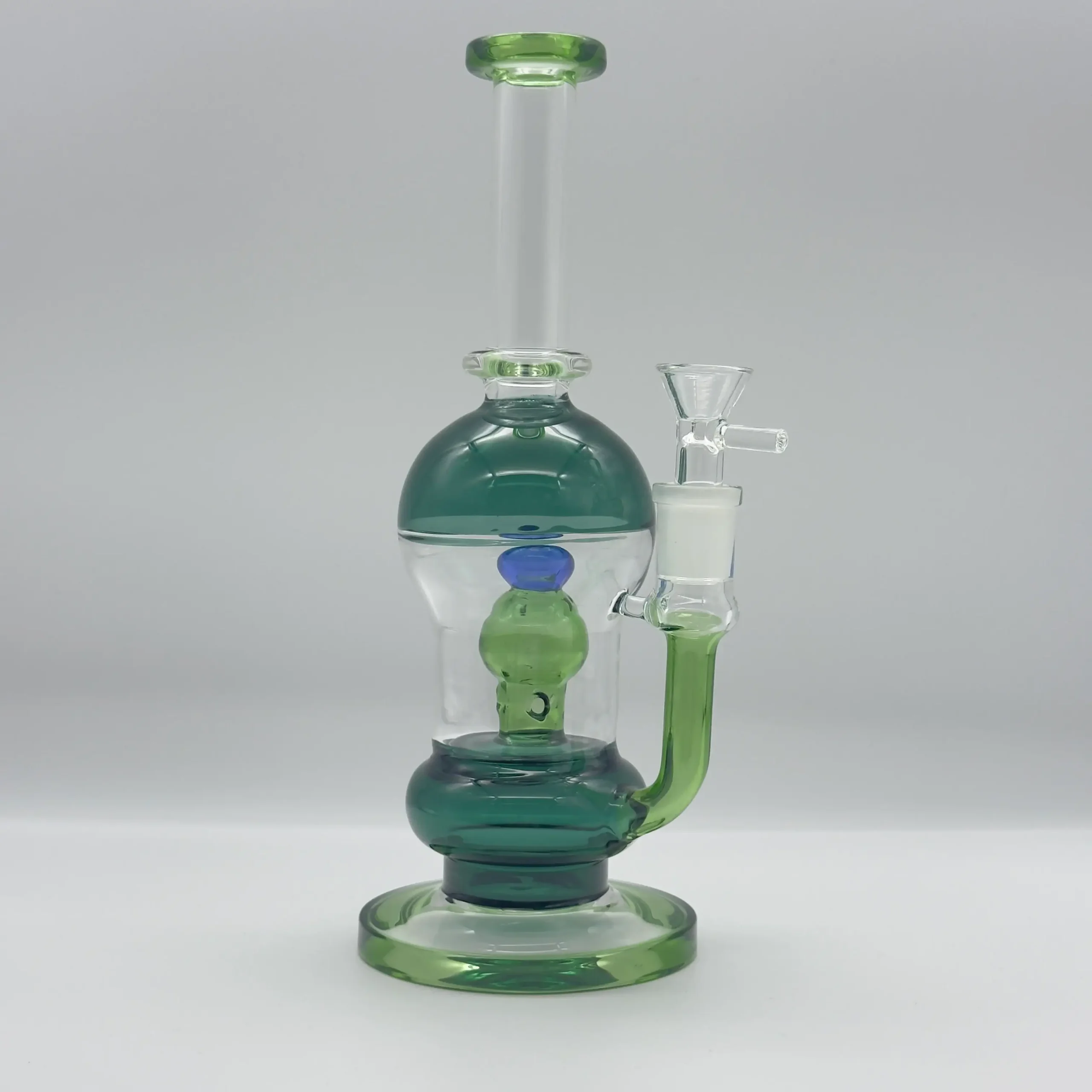 Vibrant green and blue glass accents highlight the sculpted recycler arm and sturdy base, adding a modern pop of color to any collection. The angled mouthpiece with a 19 mm diameter delivers ergonomic comfort, while the universal ground joint (compatible with most standard bowls) ensures a secure, airtight seal.