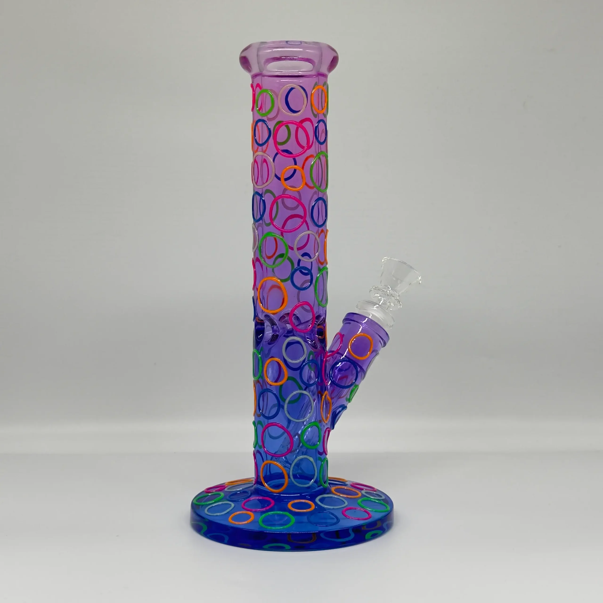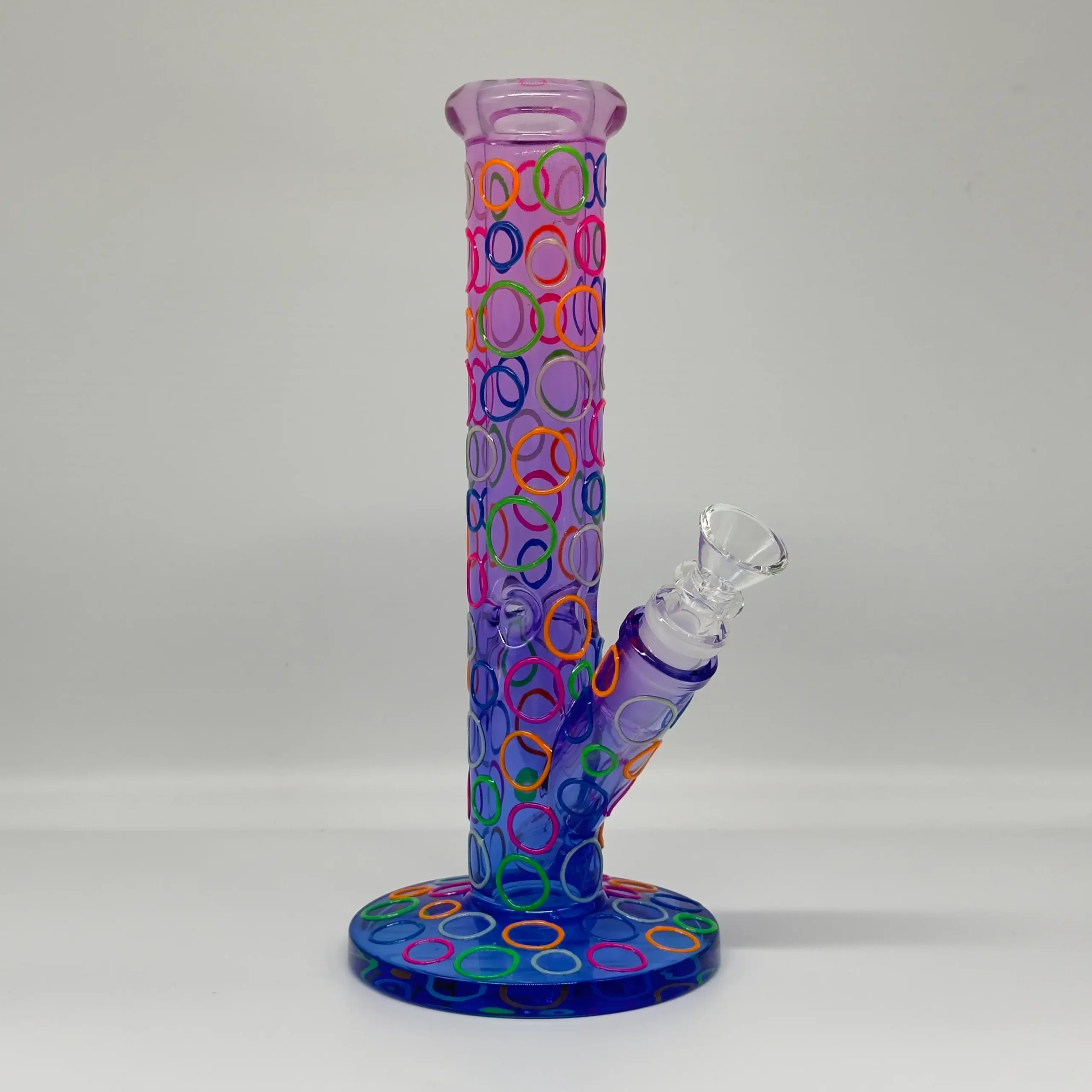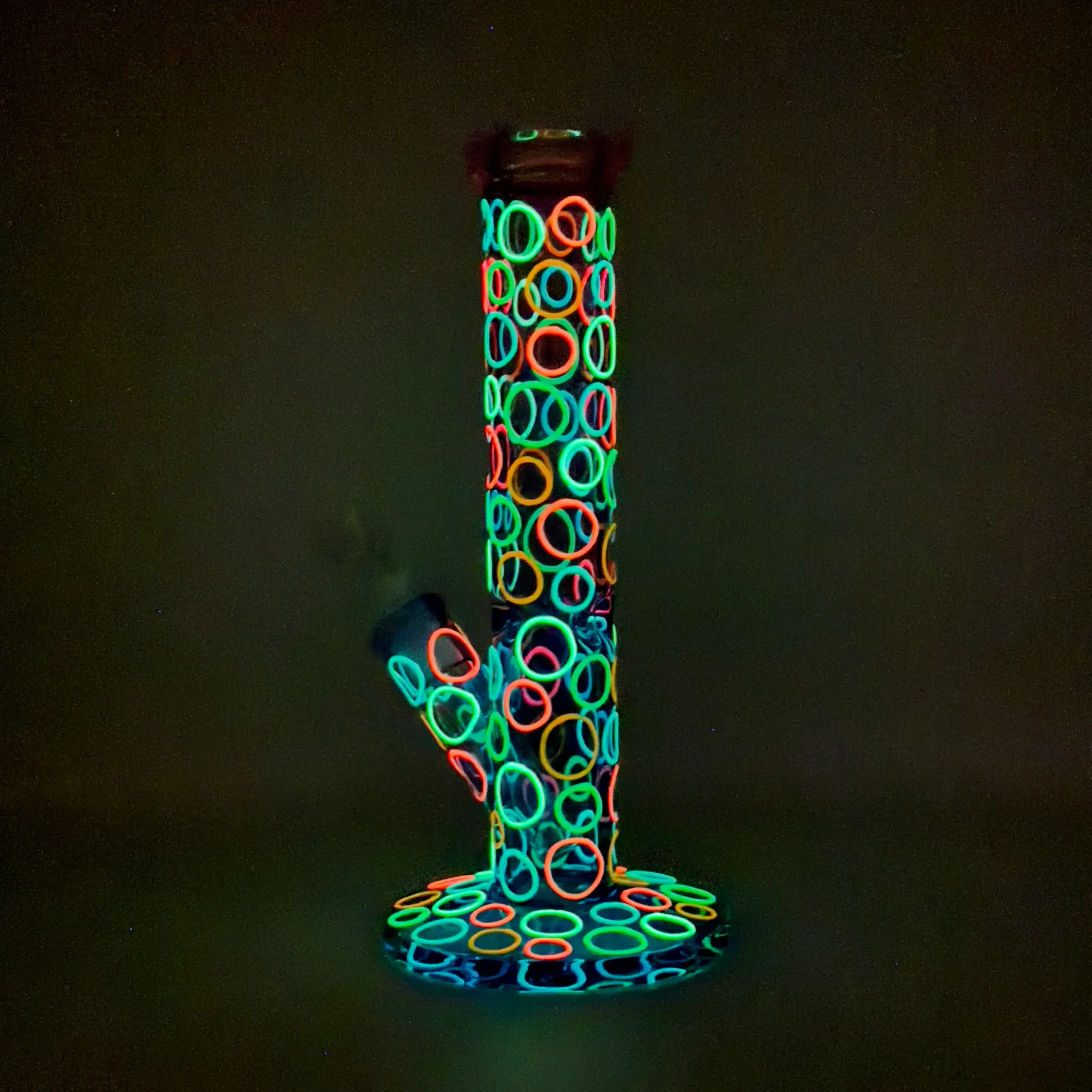 Daytime rainbow, night-time light show—this hand-blown glow-in-the-dark polka-ring glass bong is wrapped in raised neon circles that charge under normal light and explode into green, aqua, and red after dark. A 5 mm-thick straight tube delivers classic, no-drag pulls, while the extra-wide base keeps everything balanced.